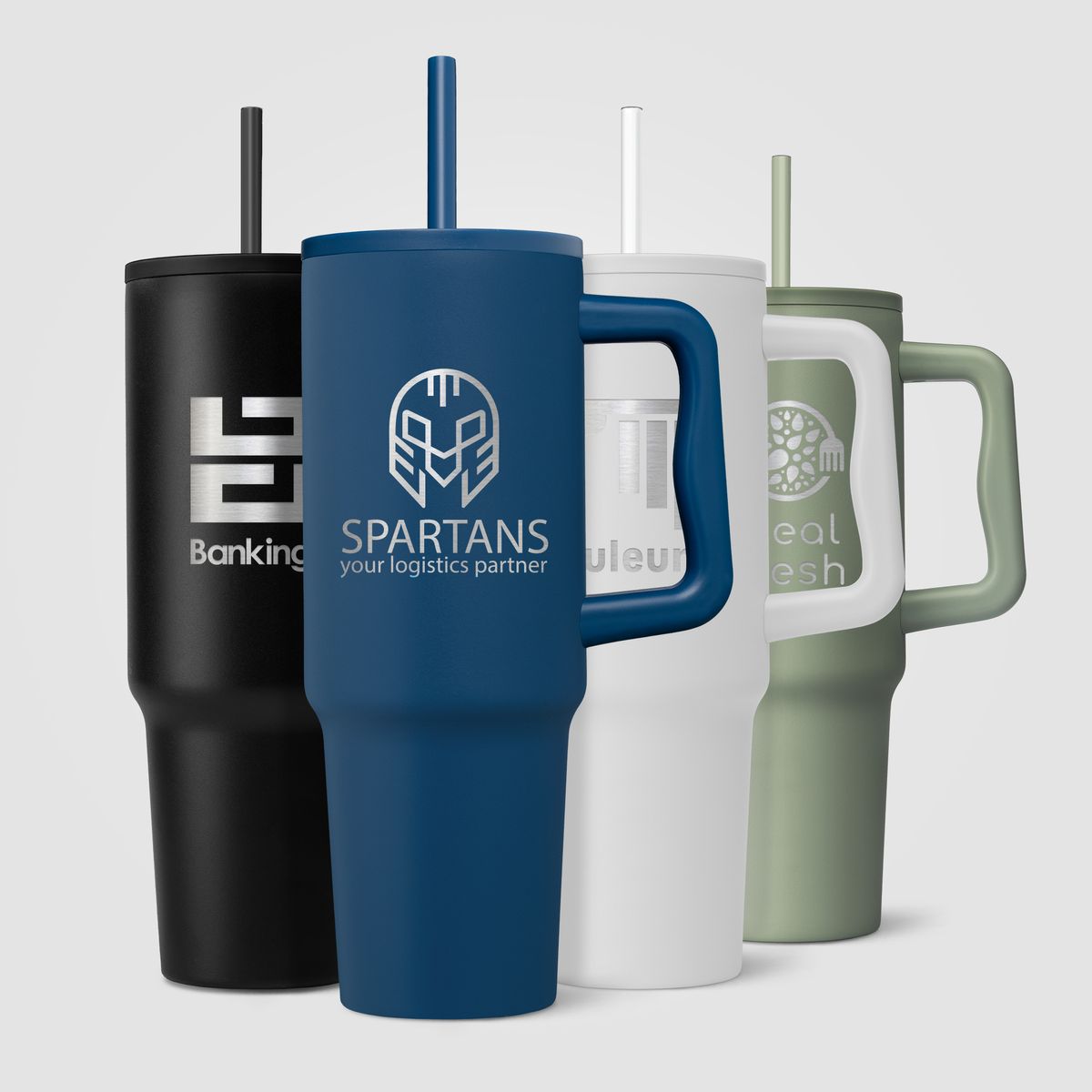 The Polar Pro - 40 oz. Double-Wall Recycled Stainless Steel Tumbler with Straw is a 40 oz. marvel crafted from recycled 304 stainless steel. Its matte finish, ergonomic handle, and compatibility with car cup holders make it both stylish and practical. The recycled PP lid and powder coating ensure longevity, while the vacuum insulation keeps hot drinks warm for 8 hours and cold ones refreshing for 24 hours. Your logo will be imprinted in Laser Engraving.