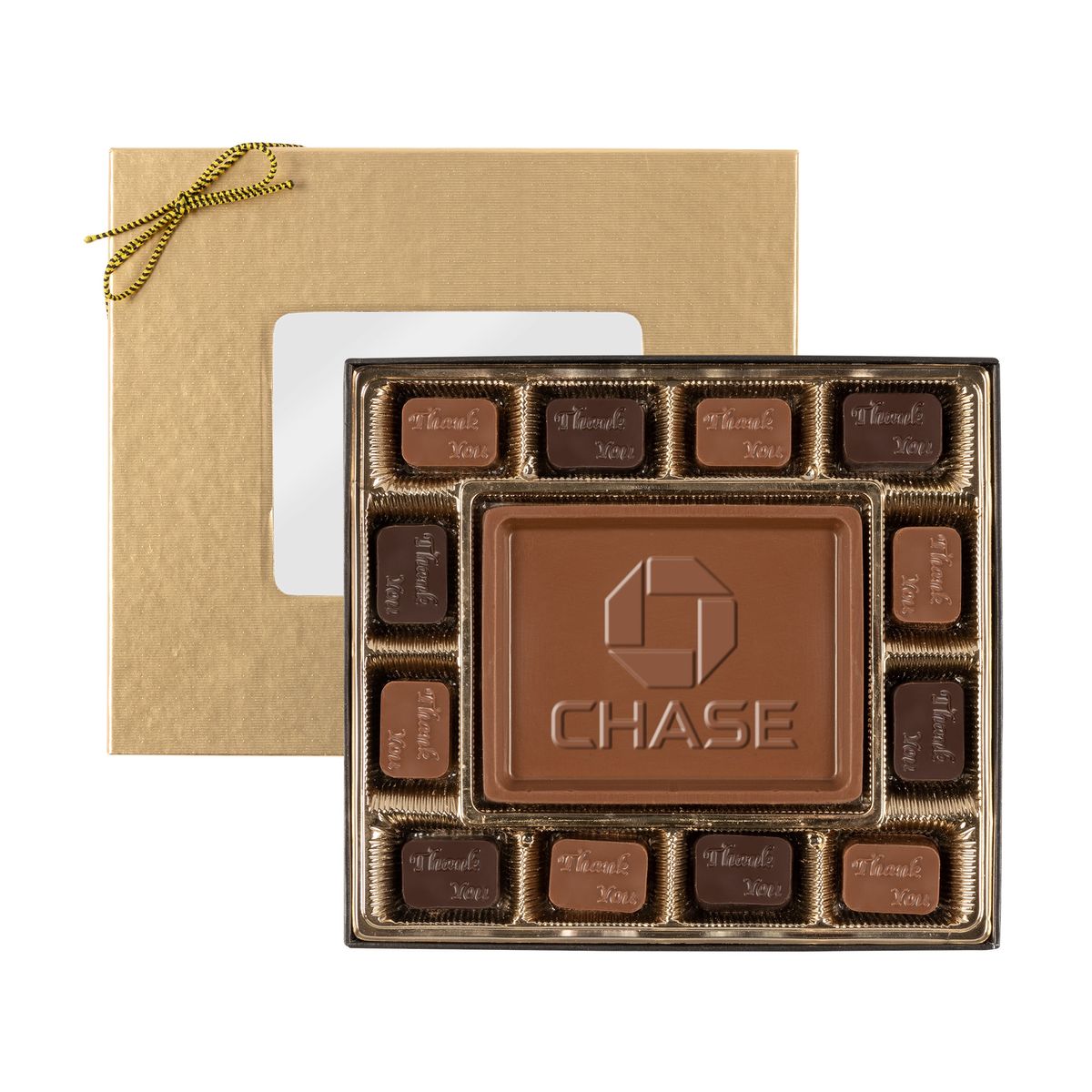 12 themed chocolate pieces surrounding a creamy milk or dark chocolate centerpiece. Each piece is molded using the finest quality Swiss chocolate. Select up to 2 themed chocolate pieces in milk and dark chocolate. Includes your choice of gold or silver packaging finished with a coordinating stretch bow. Click here to view our complete collection of chocolate pieces